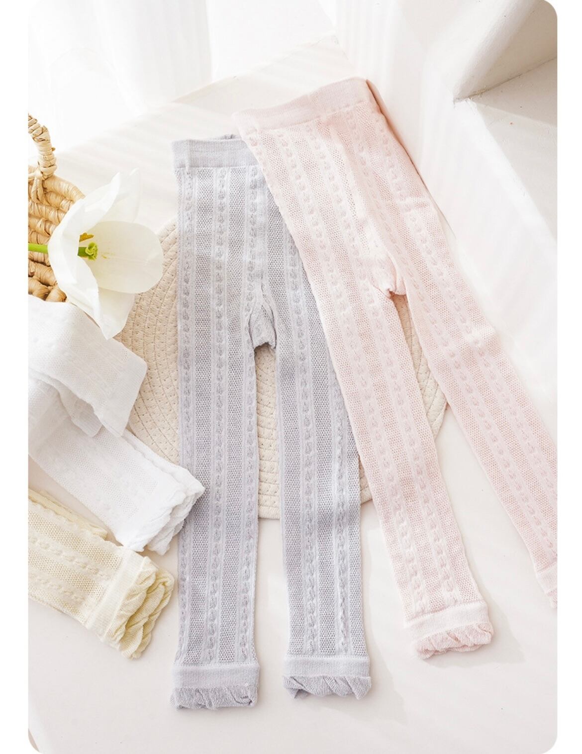 優しい色合いのサマーメッシュレギンスです。柔らかく通気性抜群で蒸れにくく、毛玉防止、伸縮性に優れた素材で、お子様に快適に履いていただけます。